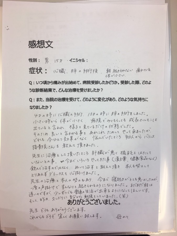 4歳の時に心臓の手術、13歳の時に肺の手術をしました。小さい時から体が小さく、病院で診てもらっても成長ホルモンは出ていると言われ、様子を見ているだけの状態でした。そのため、良いと言われることをあれこれ試してやって来ましたがどれも今ひとつ効果がなく、悩んでいたところ知人からバランス接骨院さんを教えて頂きました。先生に治療をして頂いたところ肝臓が悪く機能を果たしていないとの事。今までいろいろやってきた事(漢方薬、健康食品など)飲んで治すのではなく、ぬいて治すと教えて頂き本人も努力してとりあえずデトックスを心掛けました。